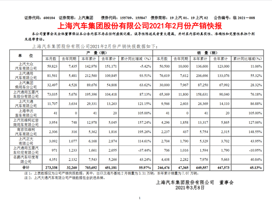 上汽集团发布2021年2月产销快报 2月产量达27万辆 发布时间: 2021-03-08 12:57:22来源:谷狗搜 阅读 3月7日消息,上汽集团发布2021年2月产销快报称:2月汽车产量为273,338(约27.3万)辆,去年同期产量为32,260(约3.2万)辆。2月汽车销量为246,476(约24.6万)辆。去年同期销量为47,365(约4.7万)辆。