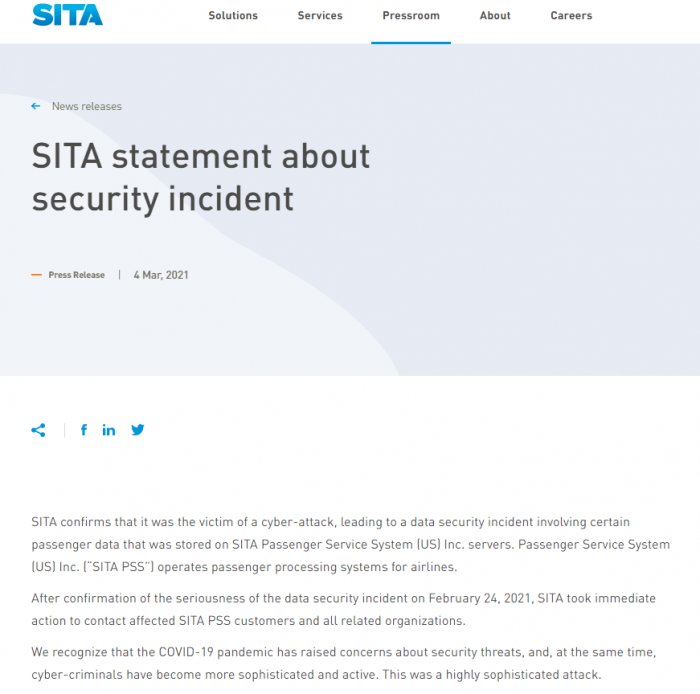 全球航空运输数据巨头SITA公司已经证实了一起涉及乘客数据的数据泄露事件。该公司周四在一份简短的声明中表示,该公司已成为“网络攻击的受害者”,存储在其美国服务器上的某些乘客数据已被泄露。2月24日该公司证实了这一网络攻击事件,之后其联系了受影响的航空公司。