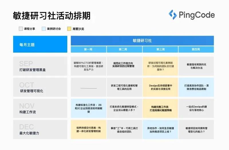 最后,为了帮助开发者及企业更好地实现敏捷开发的落地使用,PingCode敏捷研习社同步启航,通过敏捷大咖分享、案例研讨会、高管工作坊等三大主题活动,为中国各行业研发团队提供最前沿的智慧与经验,覆盖研发绩效管理、敏捷开发与DevOps落地、转型案例分享等多个模块,将立足于实践,帮助CTO/CIO/技术leader/研发人员提供全新思路,带来更为高效的输出,早日摆脱程序员版《on call24 小时》。